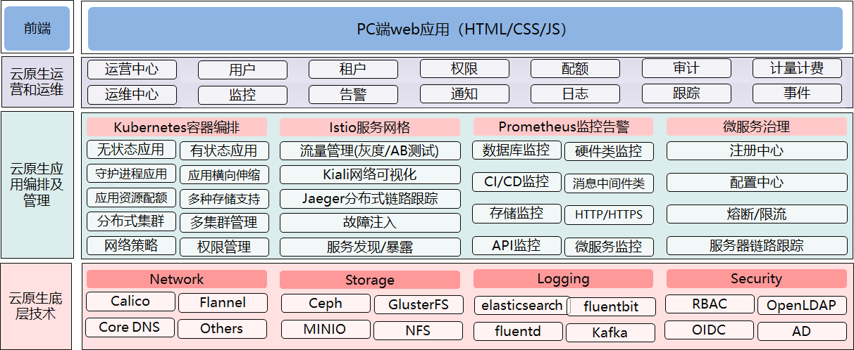 主要提供容器编排,多集群管理、应用管理、服务网格,微服务治理,监控告警,权限与安全等功能